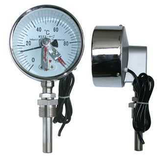電接點雙金屬溫度計是利用溫度變化時帶動觸點變化,當(dāng)其與上下限觸點接觸或斷開的同時,使電路中的繼電器動作,從而自動控制和報警。